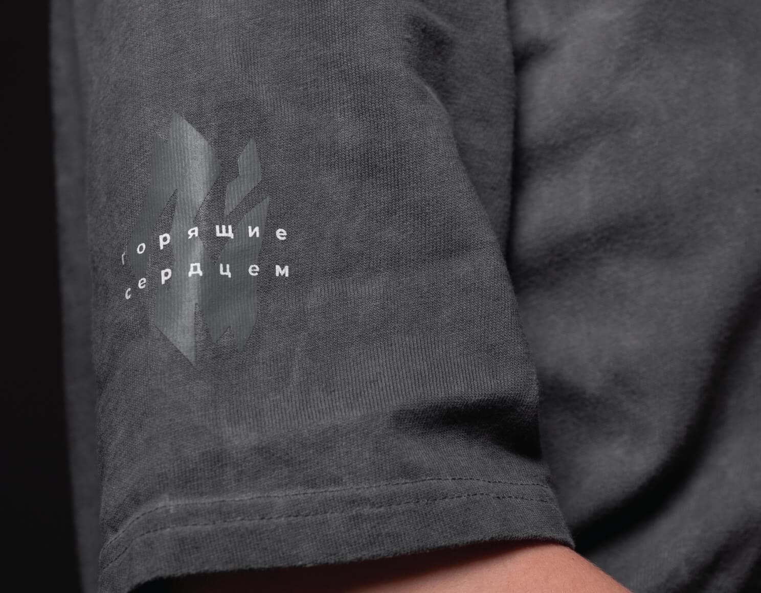 В базовом исполнении футболки мы разместили логотип на спинке и шрифтовое начертание «горящие сердцем» на плече. Так мы выстраиваем связь между объектом, его будущим владельцем и студией, разделяя общие ценностные ориентиры. Особенностью этой светло-серой футболки является авторский метод окрашивания полотна, созданный Катей в ходе пятилетних экспериментов. Просто обрати внимание на эту божественную фактуру, переходы и великолепно выкрашенные швы!